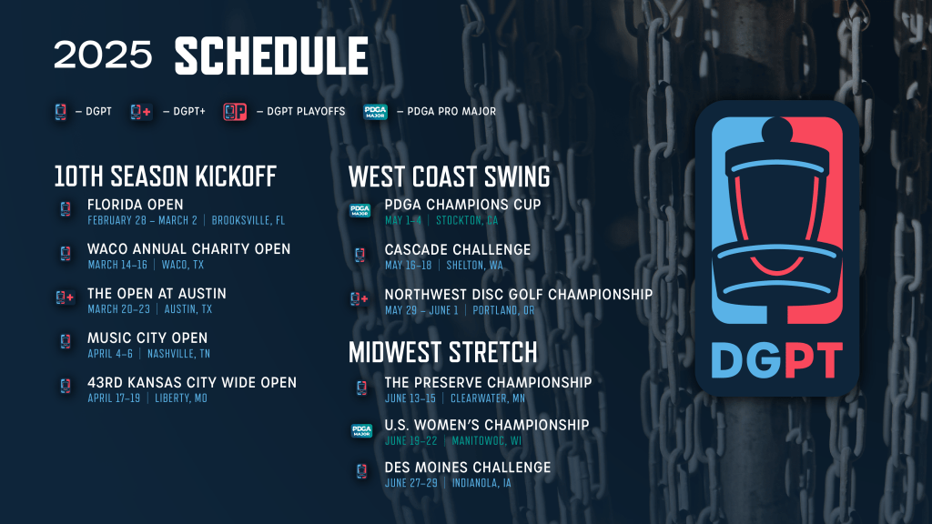 The 2025 schedule released on August 15th with some noticeable differences in the schedule for the 10 year anniversary of the Pro Tour. The biggest standout in my initial reaction is that Jonesboro Open and Dynamic Discs Open are not tour events, but will return in 2026. It sounds like the tour might be moving towards this model where they might alternate locations every year or so and I think that is great given the growth and the need to reach more markets. Personally, I love checking out new courses as they arrive on tour.